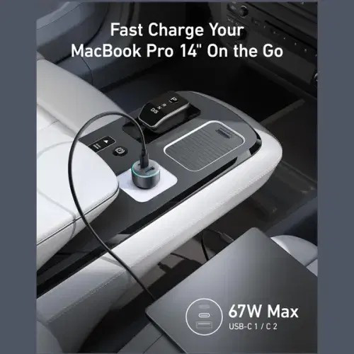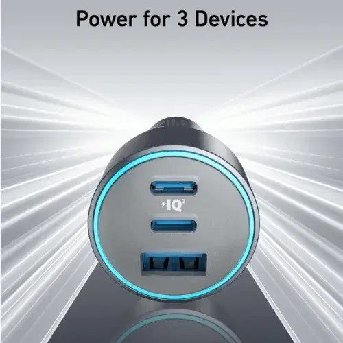 Fast-charge your devices on the go with Anker's 67W 3-port car charger. Features one USB-C Power Delivery port and two USB-A ports, delivering power to multiple devices simultaneously. Includes a USB-C to USB-C cable.